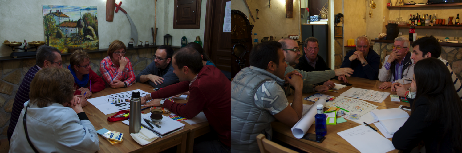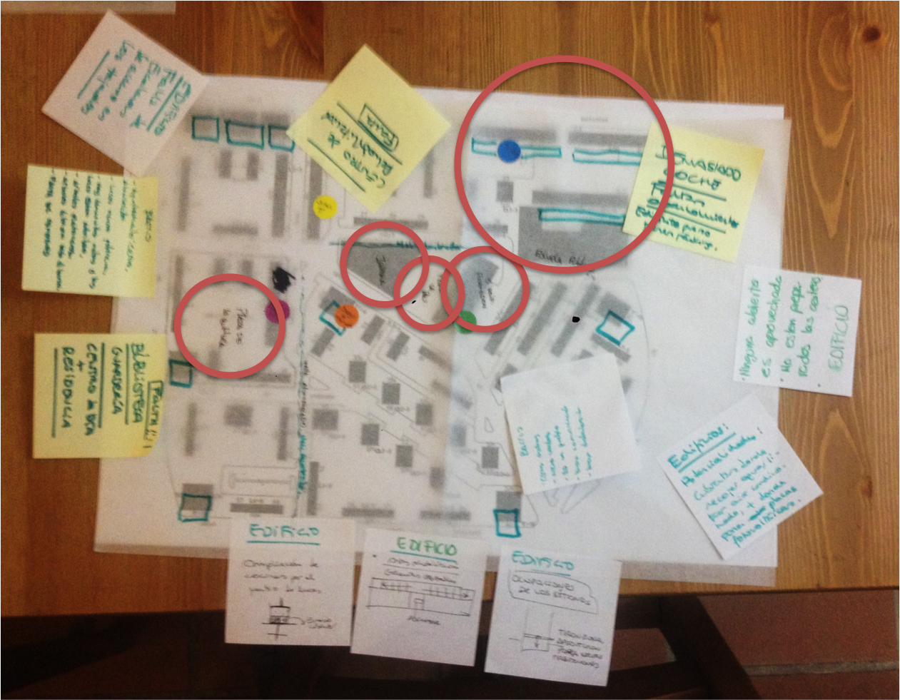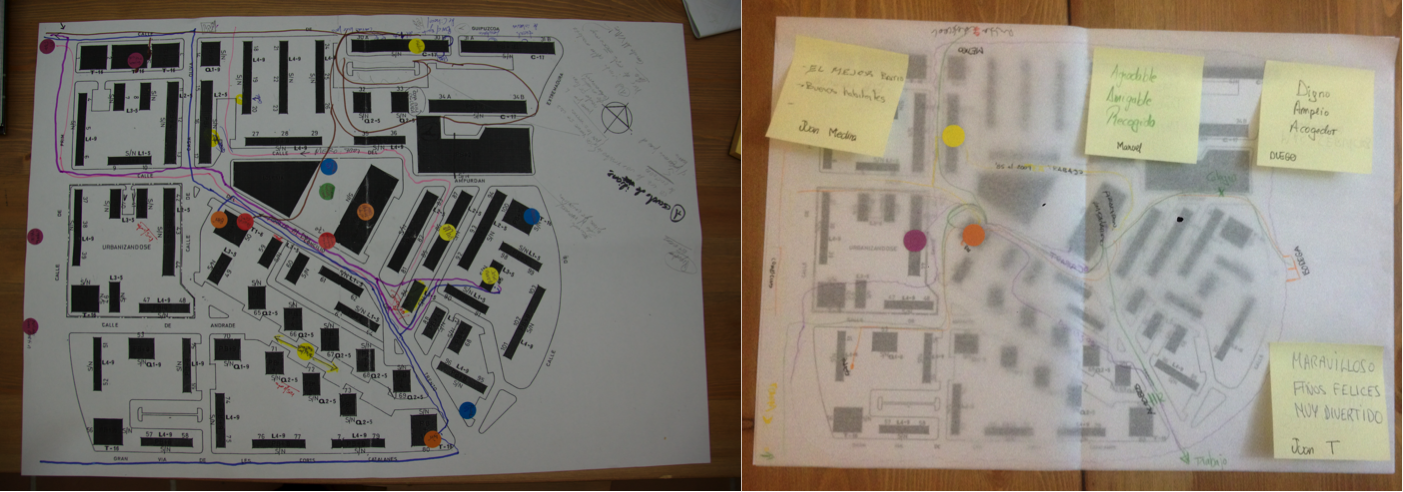 Una vez organizada la sesión con la asociación de vecinos de La Pau se trabajo en dos grupos distintos. Las mesas de trabajo fueron conformadas por un integrante de cada equipo, un tutor y usuarios pertenecientes al barrio, con la finalidad de ampliar los conocimientos y/o necesidades de cada uno de los presentes. Además de esta manera se crearon vínculos más cercanos donde los integrantes pudieron sentirse más en confianza y dio como resultado una actividad más enriquecedora dejando que ellos mismos contaran de una manera más detallada sus actividades cotidianas además de sus necesidades o molestias en el barrio.