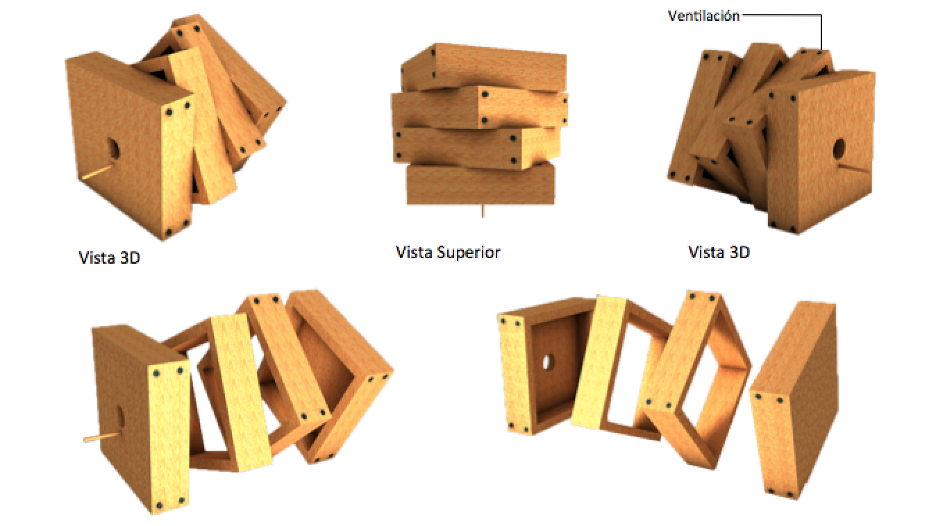 Busco crear un prototipo basándose en formas básicas, que fuera modulado y de fácil ensamblaje, para lo que decidió usar una estrategia tipo Puzzle, que también permitía la unión entre varias de ellas generando “pequeñas comunidades” de pájaros.