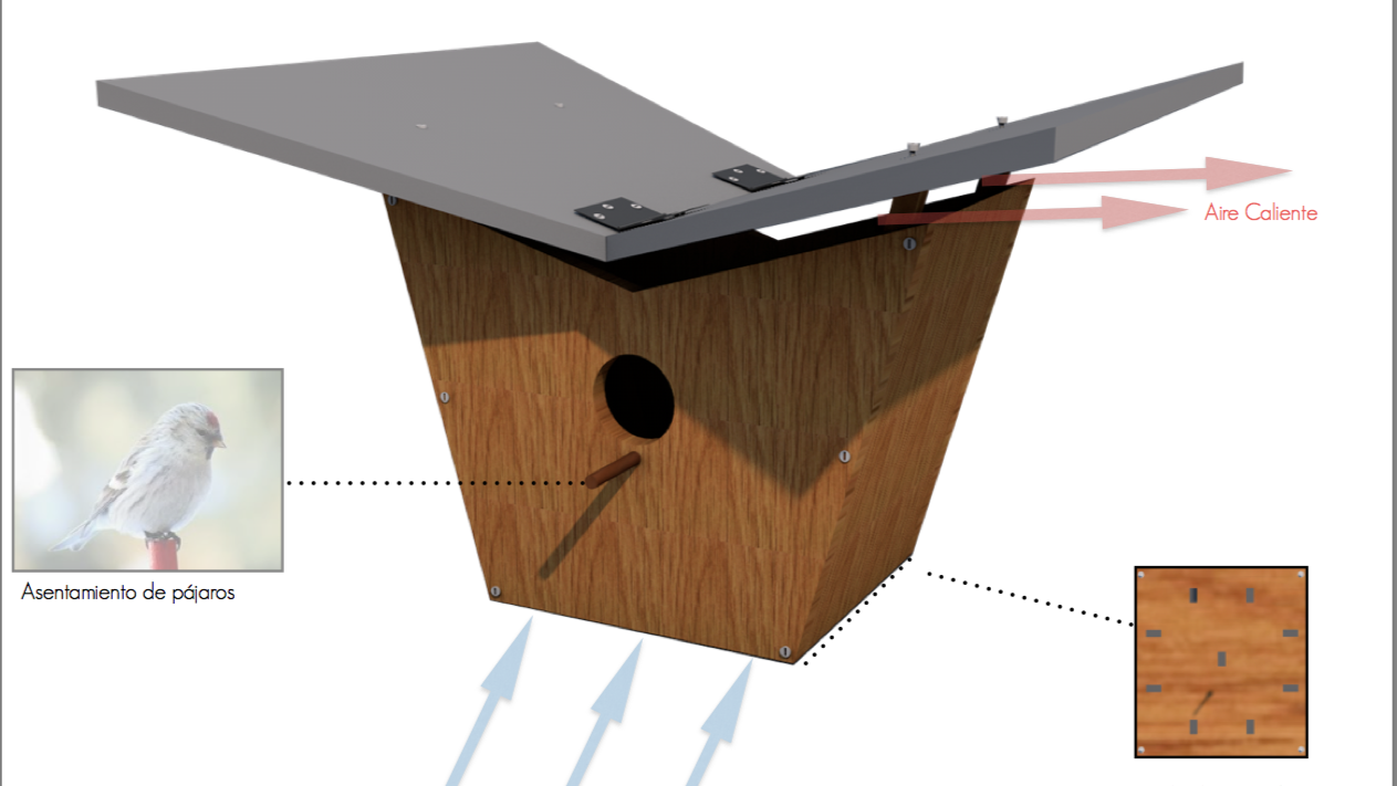 Mi propuesta consistía en una pajarera que no fue solo para pájaros en la parte inferior cuenta con un banco, que puede ser habitado por los humanos o también sirve como parte de almacenamiento, en la parte superior se coloco un área para plantas para hacer un espacio agradable al pájaro dando una sensación de bosque, y el modo de construcción pensé en un ensamblaje de encajes lo que hacia prescindir de los herrajes y disminuía el tiempo de montaje y aparte también permitía separar la pajarera del banco, generando dos dispositivos independientes.