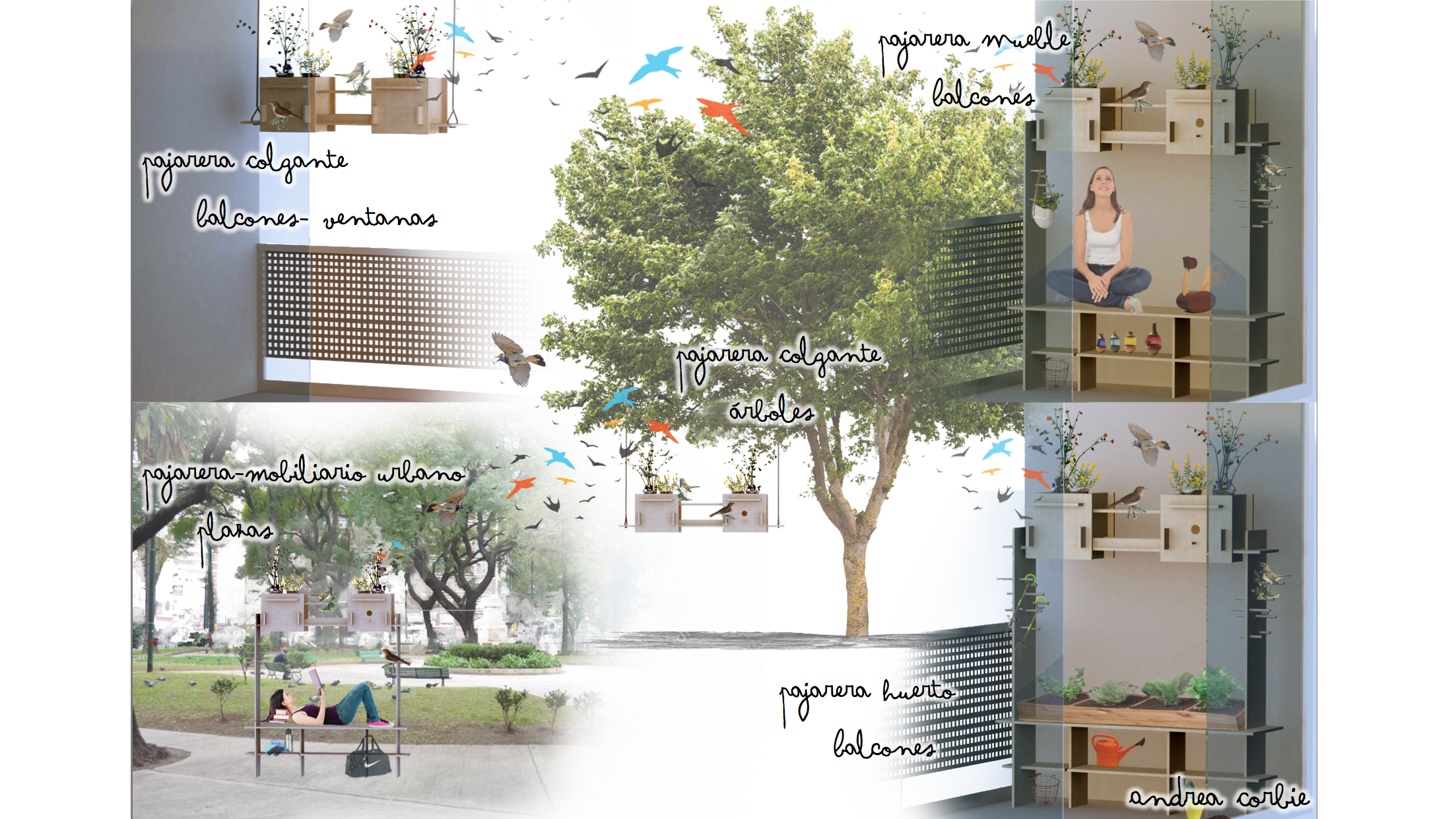 El objetivo consistía en Ubicar + Diseñar + Construir una pajarera que fuera un dispositivo global, que se pudiera adaptar a las estructuras ya existentes( Arboles, ventanas, balcones, postes, fachadas, etc), que fuera un elemento arquitectónico, autosuficiente, multi-usuario, interactivo y funcional.