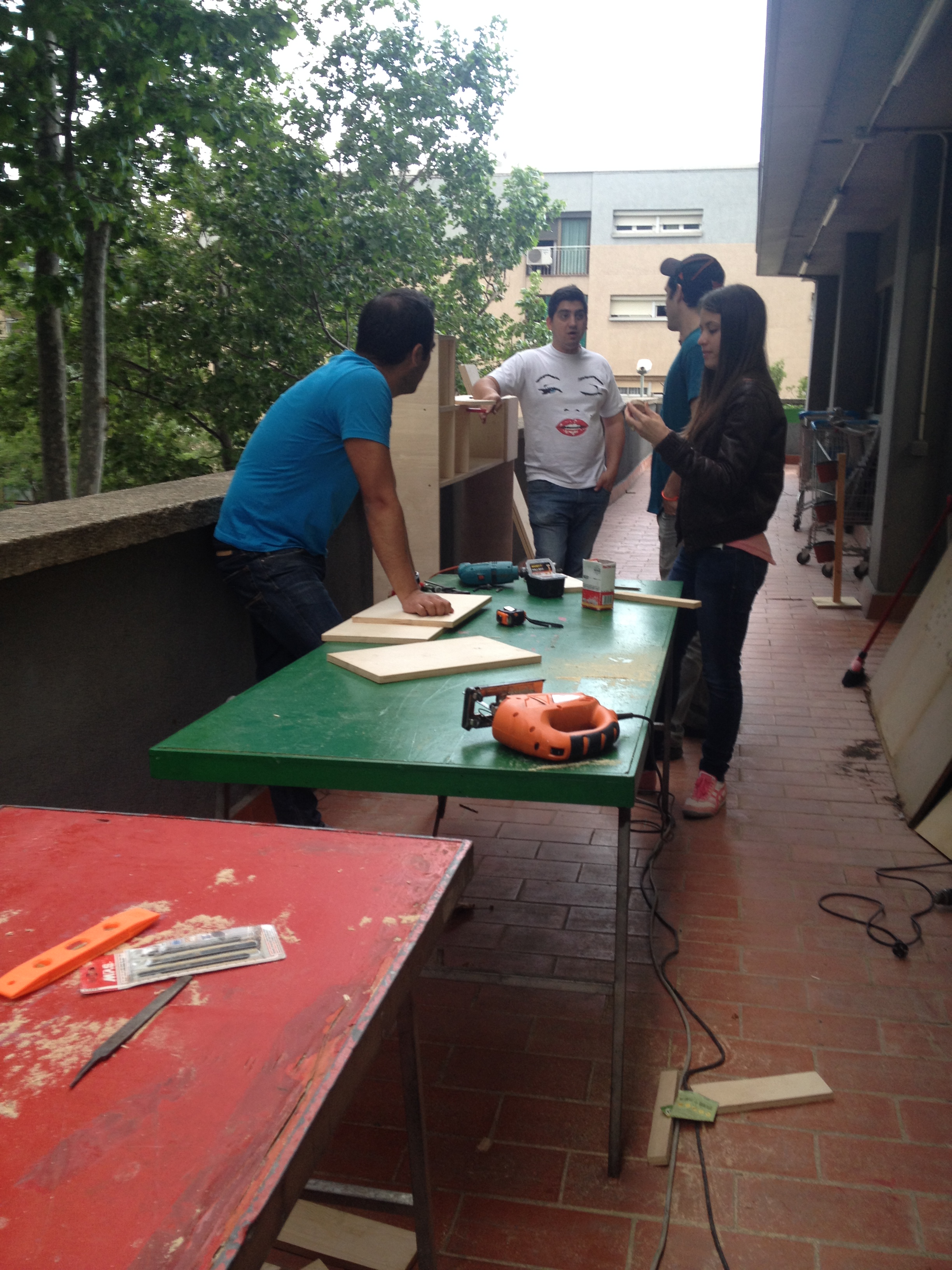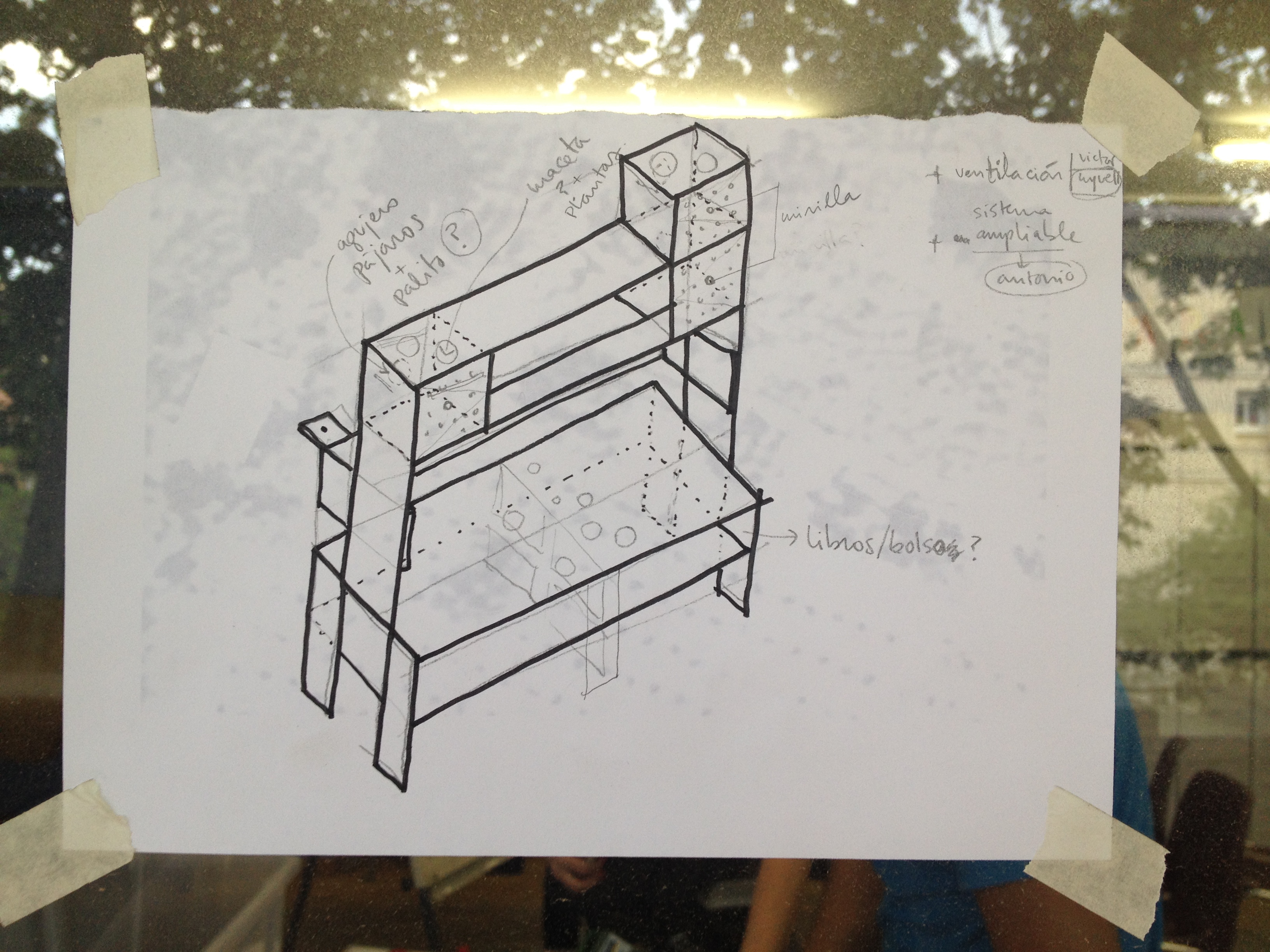Se inicio la sesión en La Pau, esta contó con la presencia de Dani Martínez, que nos explico sobre las herramientas y las formas de trabajar en madera, con el se evaluó el sistema constructivo de la pajarera modificada, y en base a sus recomendaciones se realizaron diferentes cambios, el sistema constructivo dejo de ser encajable, ya que no contábamos con la experticia técnica para usar las herramientas necesarias para ello, entonces se sustituyo por un sistema tradicional de atornillaje y en la parte del banco también se realizo la modificación de añadir un espaldar ya que este iba a estar ubicado en una terraza de manera fija.