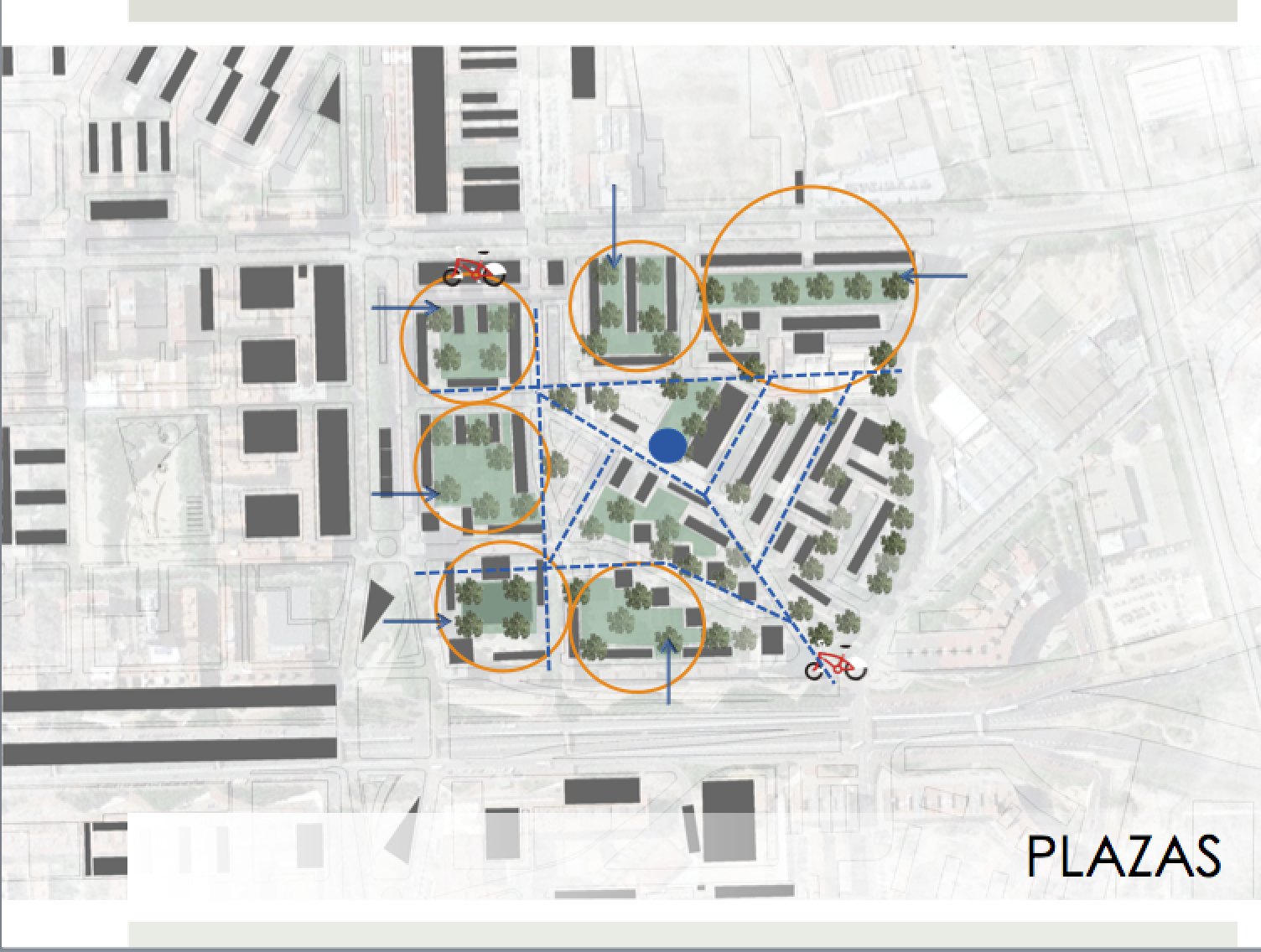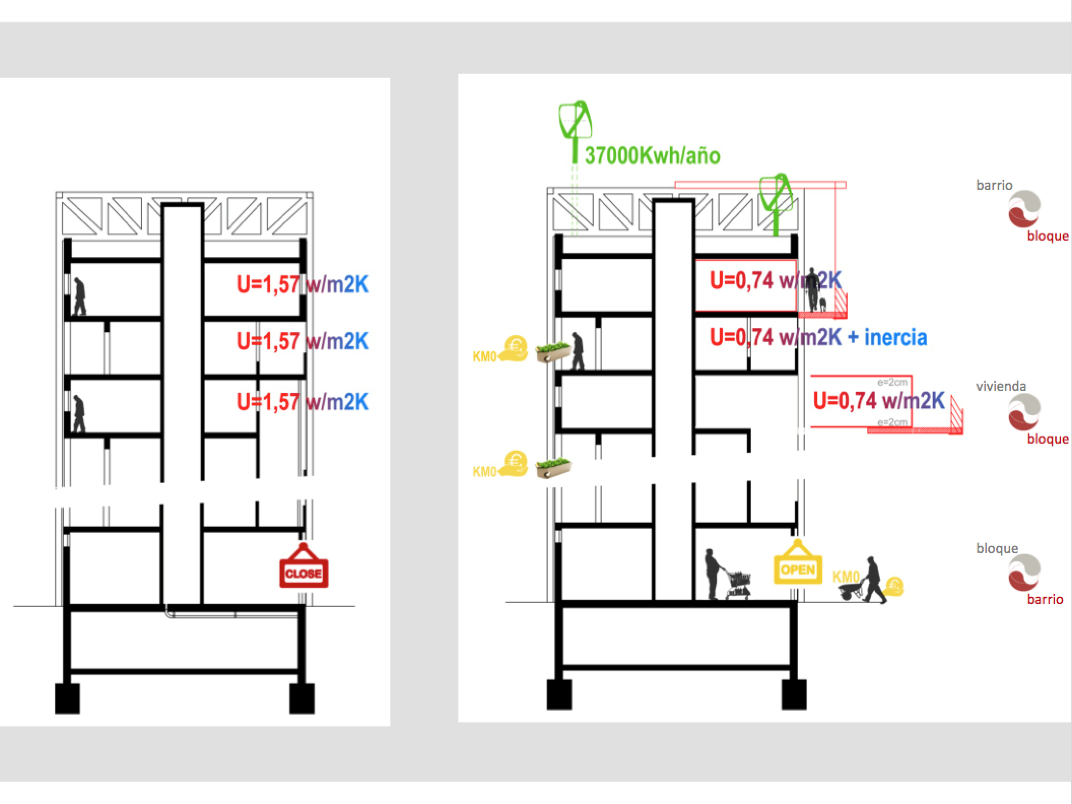 La creación de un huero urbano que conectan con el exterior del barrio tomando la planta baja de los edificios, ya que actualmente muchos de los locales se encuentran en desuso, y dejándola como una planta libre, también proponen Diversificar los tipos de viviendas y que estos distintos tipos de usuarios participan en la propuesta urbana